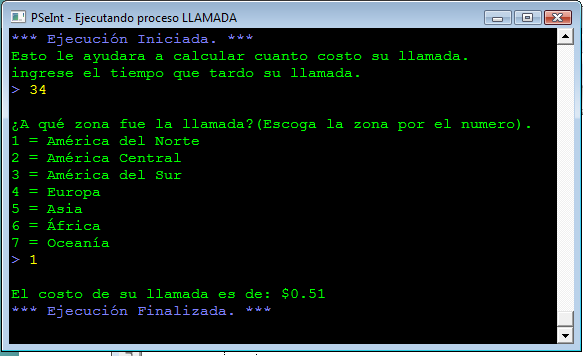 Proceso Llamada Escribir "Esto le ayudara a calcular cuanto costo su llamada." Escribir "ingrese el tiempo que tardo su llamada." Leer T Escribir "" Escribir "¿A qué zona fue la llamada?(Escoga la zona por el numero)." Escribir "1 = América del Norte" Escribir "2 = América Central" Escribir "3 = América del Sur" Escribir "4 = Europa" Escribir "5 = Asia" Escribir "6 = África" Escribir "7 = Oceanía" Leer Z Segun Z Hacer 1: Si T <= 3 Entonces precio <- (T * 2)